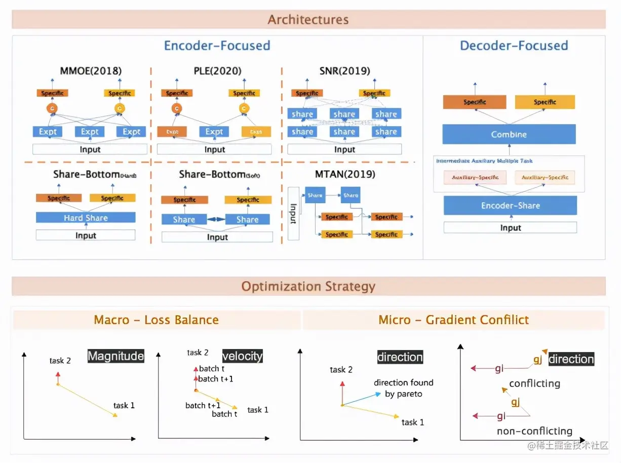 多任务多目标出现跷跷板、负迁移现象,微观的梯度冲突是本质。不论是从Architecture 还是 Optimization strategy两个维度来优化升级,殊途同归,都是要缓解冲突,减少多任务间的内耗。