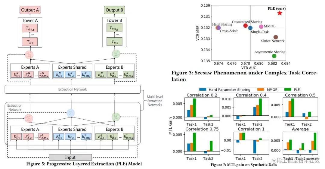 在MMoE的基础上,为每个任务增加了自己的specific expert,上文中已经解释了为什么specific expert为什么有效。看下图右上角的子图,PLE是唯一做到多任务共赢“well done”。MMoE是唯一做到“还不错”【一平一涨】。其余方法是跷跷板现象。Hard Sharing是负迁移。观察在不同相似度的多任务上,PLE都表现优秀。