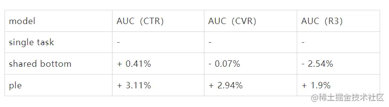 在我们自己的数据集上,做了一个简单对比。3个预估目标,CTR、CVR、R3。Share-Bottom出现了翘翘板现象,但是PLE能够实现多目标的共赢现象,下表展示了模对于single task的相对提升。