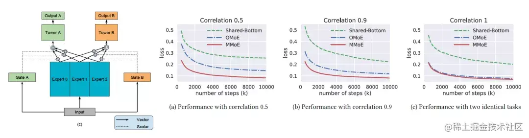 这个文章中,有一个非常有意思的做法:人工控制两个任务的相似度,然后观测不同网络结构在不同任务相似度的表现效果。得出一个结论:MMoE在多任务之间的的相关性( relatedness )比较低的时候,效果也能很不错。