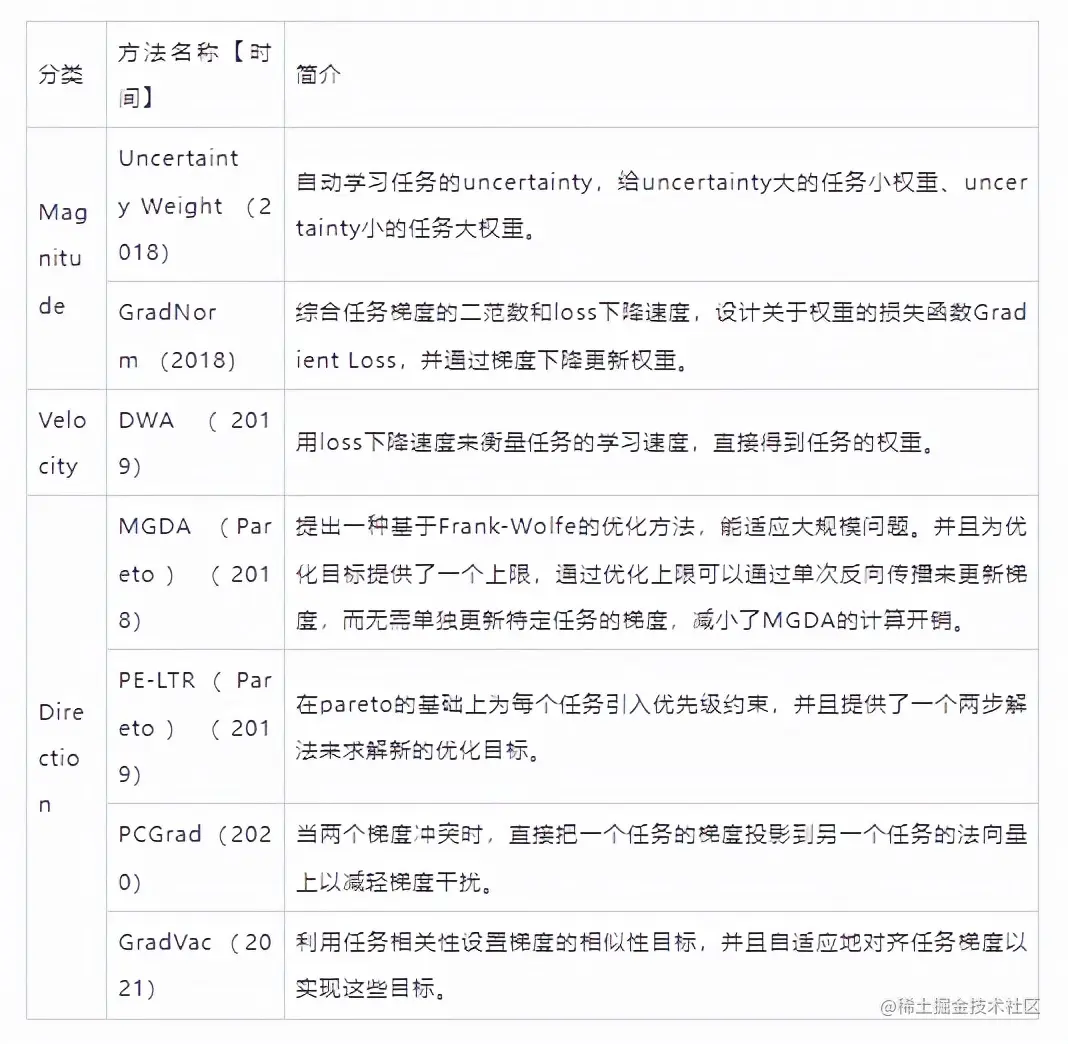 Optimization Strategy多目标优化策略从loss、Gradient的视角去思考任务与任务之间的关系。在微观层面缓解梯度冲突,参数撕扯,在宏观层面达到多任务的balance。如下表列出了目前常见的方法【后文会详细介绍其中几种方法的原理和推导】。