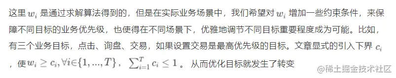 这个方法是探索任务级别的平衡关系,求解w。WWW 2021年微信文章《Personalized Approximate Pareto-Efficient Recommendation》提出来在视频推荐任务中不同用户在意侧重的目标(视频点击率 vs 视频完播率)是不一样的,求解的w不应该是在任务维度,而是每个用户样本,都应当有自己的一组w。这个出发点是有价值的,但在我们的业务中,更有价值的可能是按照人群group来得到自己的一组w,如新用户更加注重引导点击,老用户更家注重引导交易,如消费品行业更加注重交易,非消行业着重引导询盘,实现多目标共同增长。国家/行业/用户分层等群体目标差异的优化,也是一个有意思有价值的点。