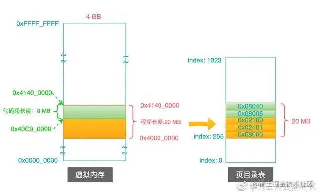 操作系统首先从虚拟内存中,分配一块20MB的空间,假设从1 GB(0x4000_0000)的地址处开始吧,这个地址是线性地址。