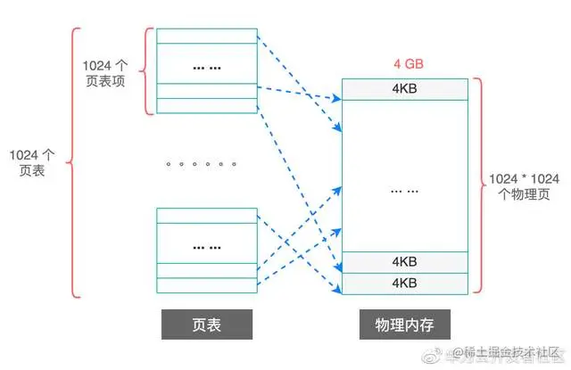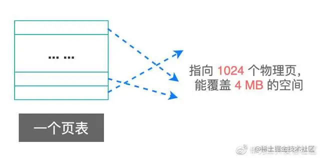 每一个页表项指向一个 4KB 的物理页,那么一个页表中 1024 个页表项,一共能覆盖 4MB 的物理内存;