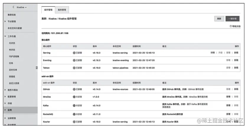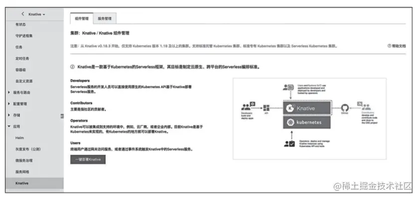 进入集群之后,选择左侧的“应用”,找到 “Knative” 并点击“一键部署”,如图所示。