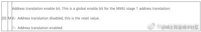 上表是SCTLR (System Control Register)寄存器bit0功能描述信息,了解更多寄存器相关信息可以参考Cortex-A7MPCore Technical Reference Manual。