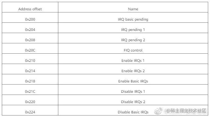 以上表格是interrupt寄存器偏移地址,读者想了解详细寄存器相关信息请参考官方芯片手册。