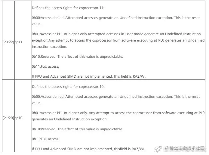 上表为寄存器CPACR bit20-23功能描述信息,了解更多寄存器相关信息可以参考Cortex-A7 MPCore Technical Reference Manual。