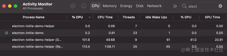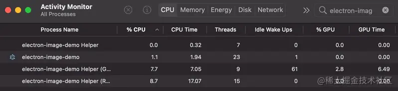 - Electron CPU:~17.5% (1.1 + 7.7 + 8.7) 和 GPU ~2.8%