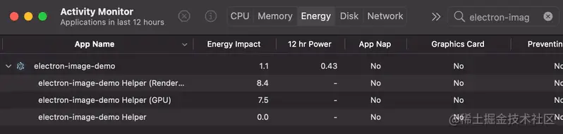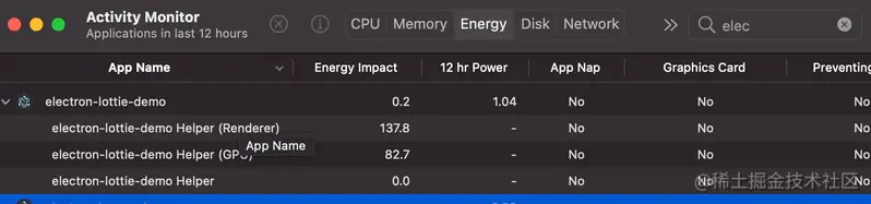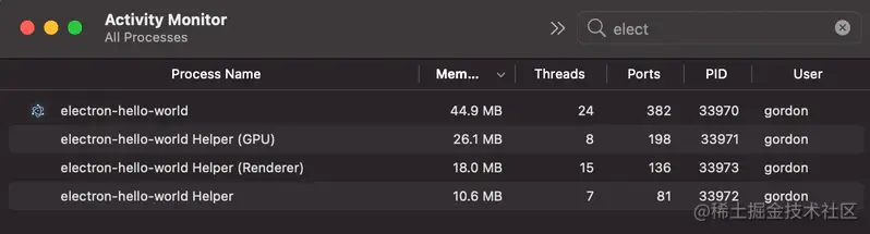 活动监视器展示了 macOS 上的 Electron“Hello, World”应用程序。