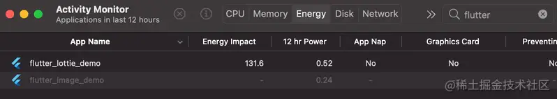 - Flutter 的 CPU 和 GPU 使用率较低:约 130% (CPU) 和约 13% (GPU)