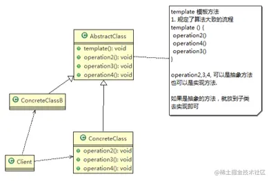 AbstractClass 抽象类, 类中实现了模板方法(template),定义了算法的骨 架,具体子类需要去实现 其它的抽象方法operationr2,3,4