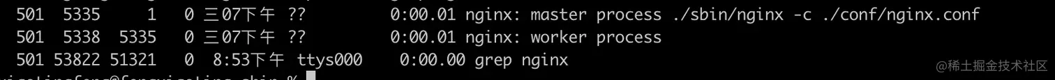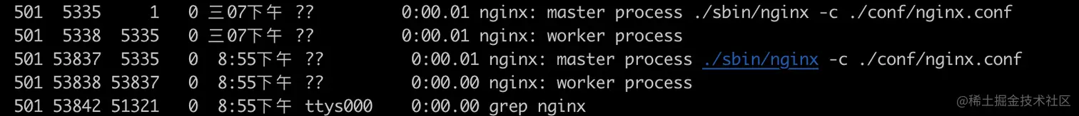 - 使用kill -USR2 5335告诉nginx要开始进行热部署了,执行这个命令之后,我们再查看进程,会发现master进程会启一个新的master进程(下午8:55的这个进程),这个新的master进程使用的nginx二进制文件是1.21.3版本的二进制文件,新的master进程会生成一个新的worker进程,请求就会被转到新的nginx中。
