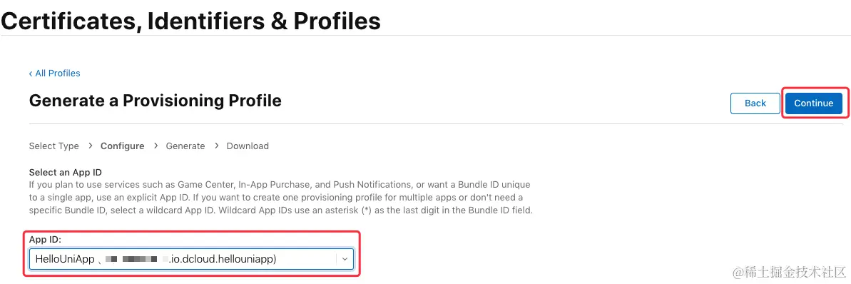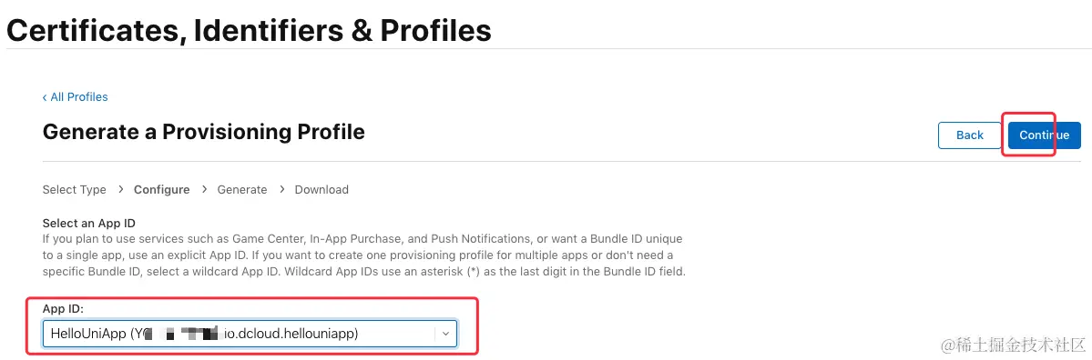 这里要选择之前创建的 “App ID” (这里是“io.dcloud.hellouniapp”),点击“Continue”:\