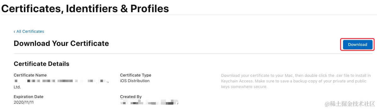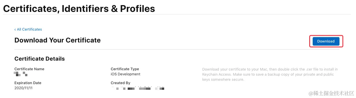 生成证书后选择 “Download” 将证书下到本地 (ios_development.cer):\