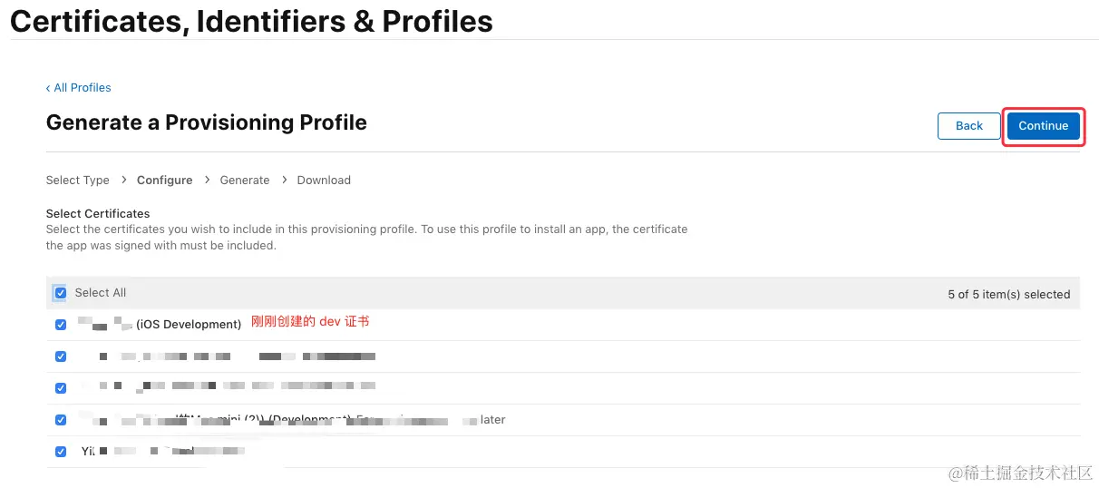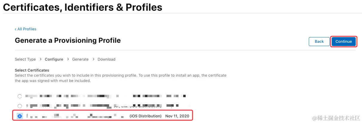 接下来选择需要绑定的发布证书(iOS Distribution),这里勾选刚刚生成的发布证书”,点击“Continue”:\