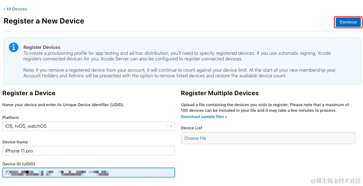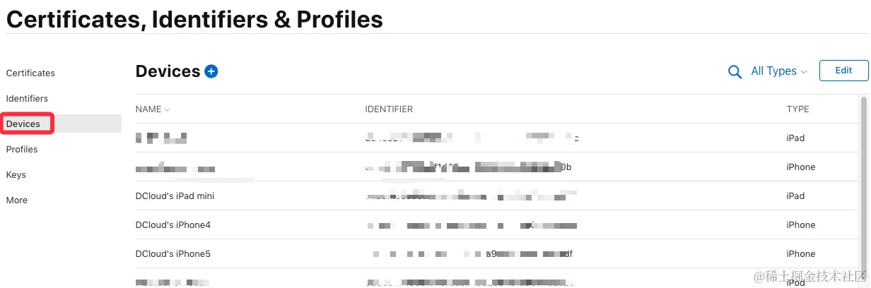 在证书管理页面选择 “Devices”,可查看到已添加的所有设备信息,点击页面上的加号来添加一个新设备:\