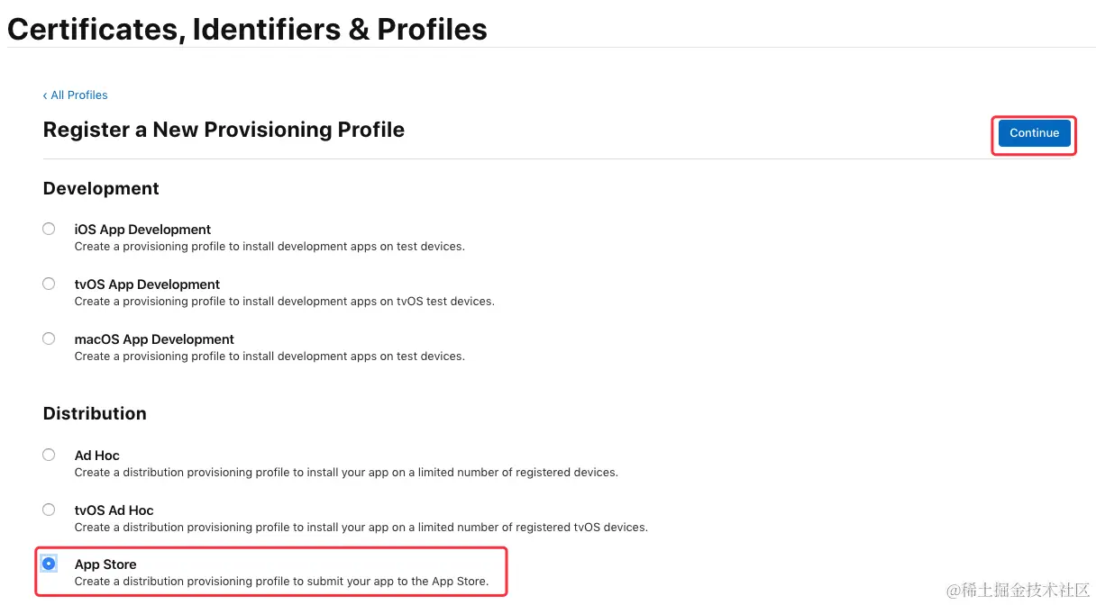 在 “Distribution” 栏下选中 “App Store”,点击“Continue”按钮:\