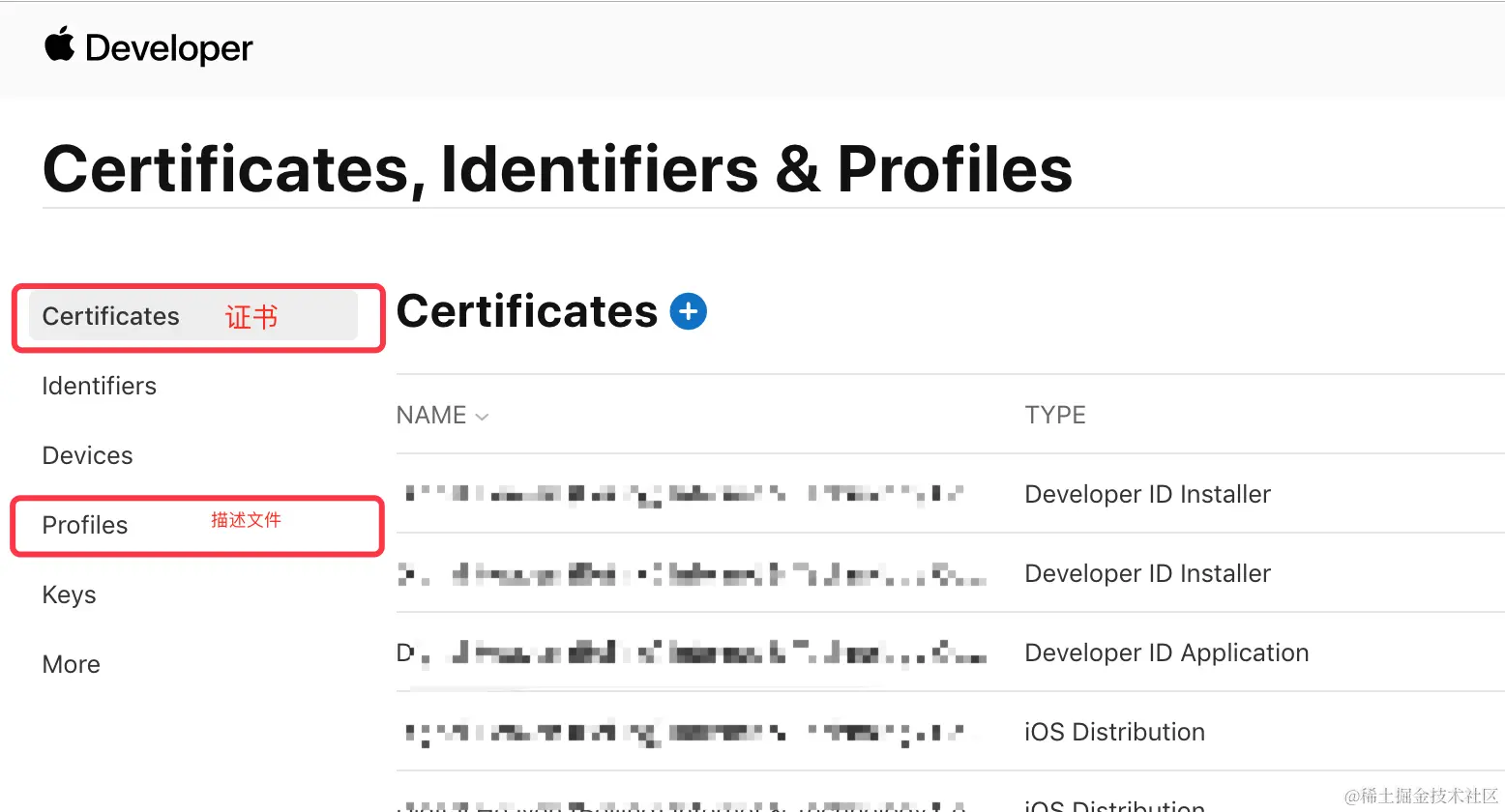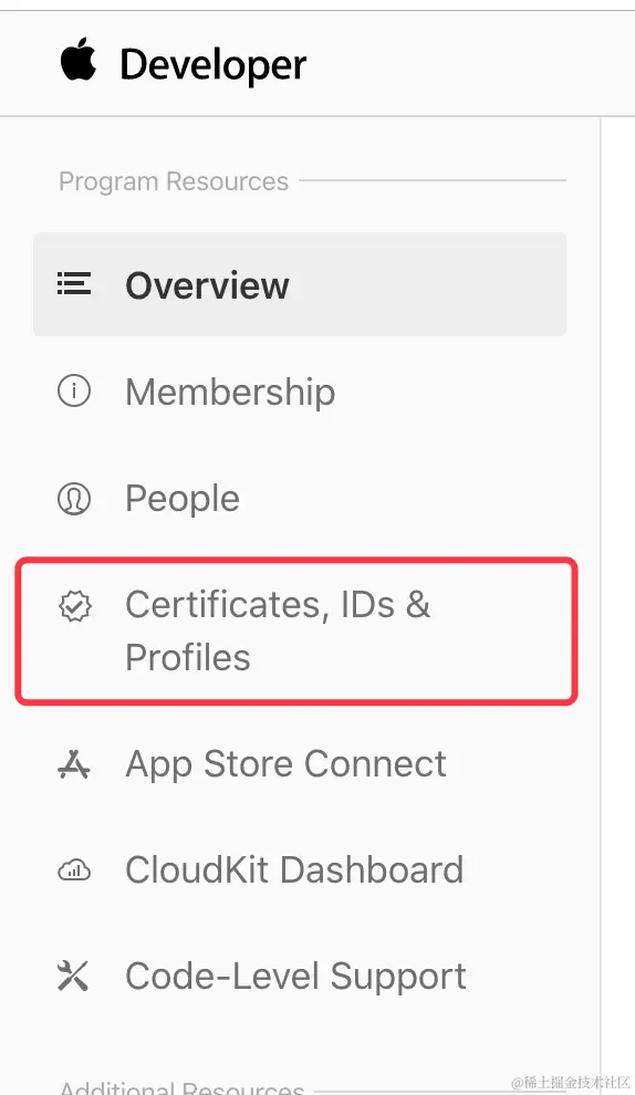 登录成功后在页面左侧选择 “Certificates,IDs & Profiles” 进入证书管理页面:\