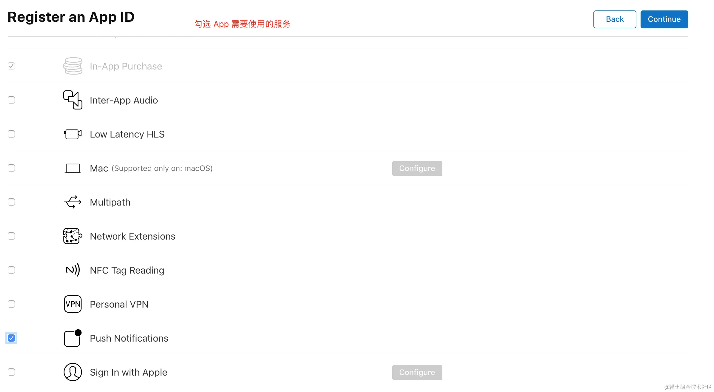 接下来需要选择应用需要使用的服务(如需要使用到消息推送功能,则选择“Push Notifications”),然后点击 “Continue”