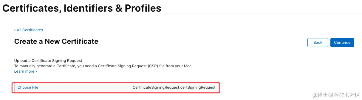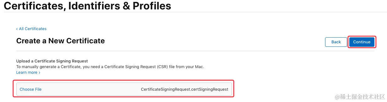 接下来同样需要用到之前生成的证书请求文件,点击“Choose File...”选择刚刚保存到本地的 “CertificateSigningRequest.certSigningRequest”文件,点击 “Continue” 生成证书文件:\