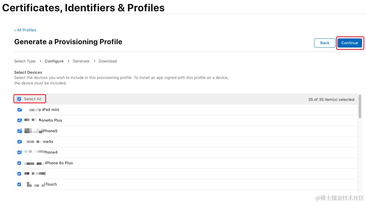 选择授权调试设备,这里建议直接勾选 “Select All”,点击 “Continue”:\