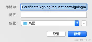 文件名称为“CertificateSigningRequest.certSigningRequest”,选择保存位置,点击 “存储” 将证书请求文件保存到指定路径下,后面申请开发(Development)证书和发布(Production)证书时需要用到\