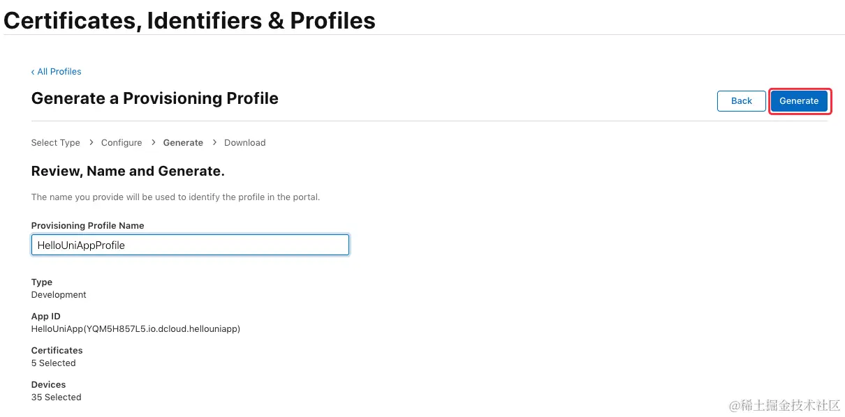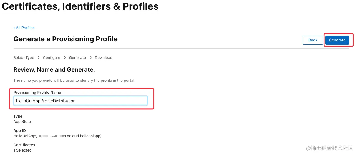 输入描述文件的名称(如“HelloUniAppProfile”), 点击 “Generate” 生成描述文件:\