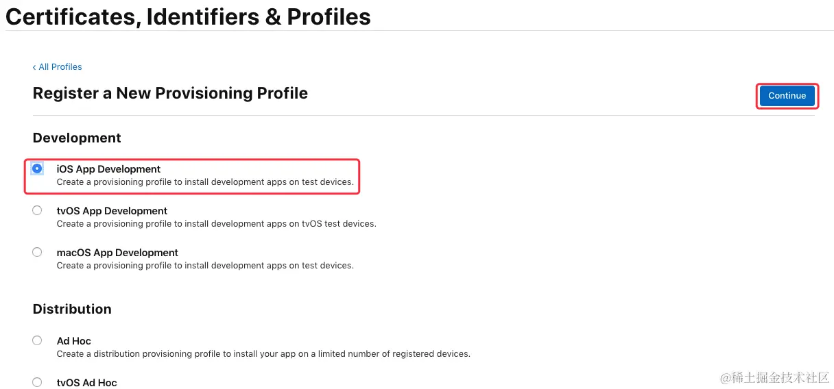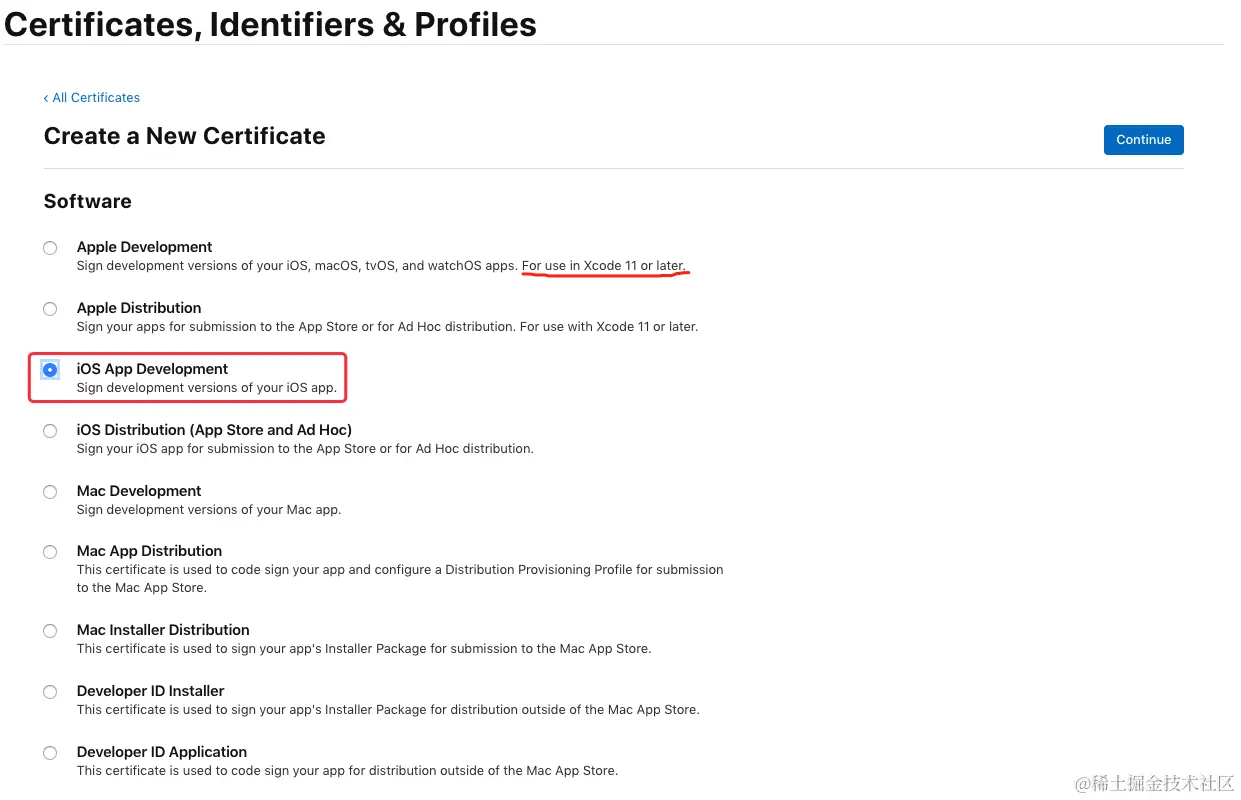 在 “Development” 栏下选中 “iOS App Development”,点击“Continue”按钮:\
