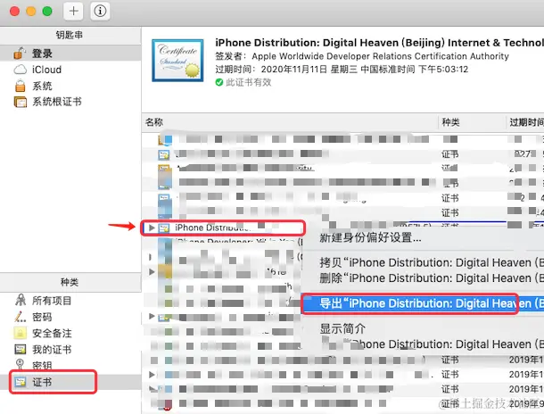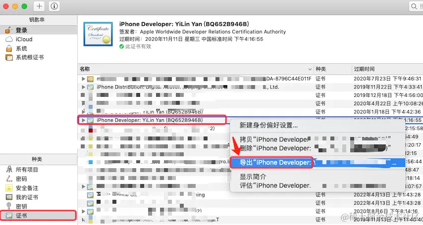 双击保存到本地的 ios_development.cer 文件,会自动打开 “钥匙串访问” 工具说明导入证书成功,可以在证书列表中看到刚刚导入的证书,接下来需要导出 .p12 证书文件,选中导入的证书,右键选择 “导出...”:\