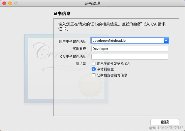 打开创建请求证书页面,在页面中输入用户邮件地址、常用名称,选择存储到磁盘,点击 “继续” :\