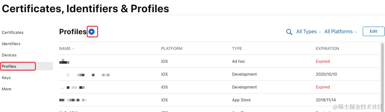 在证书管理页面选择 “Profiles”,可查看到已申请的所有描述文件,点击页面上的加号来添加一个新的描述文件:\