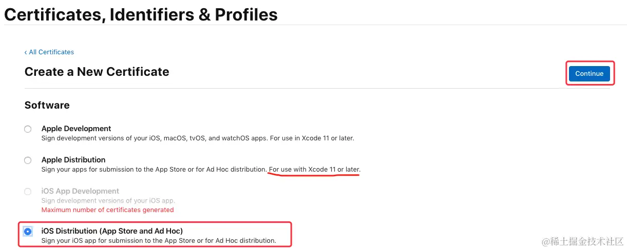 在 “Software” 栏下选中 “App Store and Ad Hoc”,点击 “Continue”:\