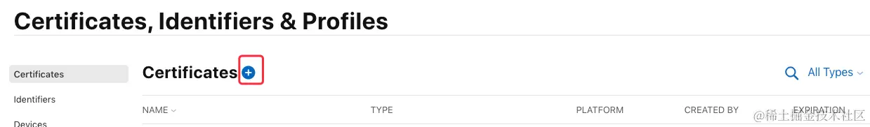 在证书管理页面选择 “Certificates" 可查看到已申请的所有证书(TYPE:Development 为开发证书,Distribution为发布证书),点击页面的加号来创建一个新的证书:\