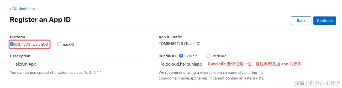 平台选择 “iOS,tvOS,watchOS”,Bundle ID 选择 “Explicit”,在 Description 中填写描述,然后填写 Bundle ID,Bundle ID 要保持唯一性,建议填写反域名加应用标识的格式 如:“io.dcloud.hellouniapp”, 然后点击 “Continue”