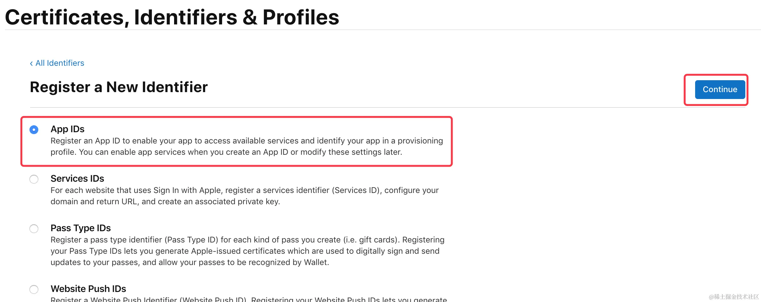 选择标识类型为 “App IDs”,然后点击 “Continue”\