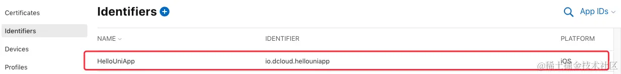 确认后选择提交,回到 identifiers 页面即可看到刚创建的App ID:\