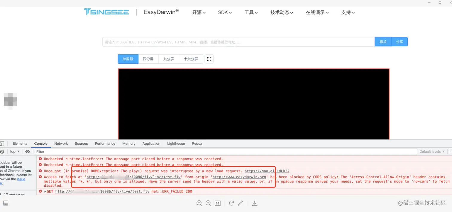 当我们测试EasyDSS不同格式视频流的直播时,发现只有当浏览器打开flv地址进行播放,才会出现跨域的错误,视频不能播放,其他接口访问则没有问题。