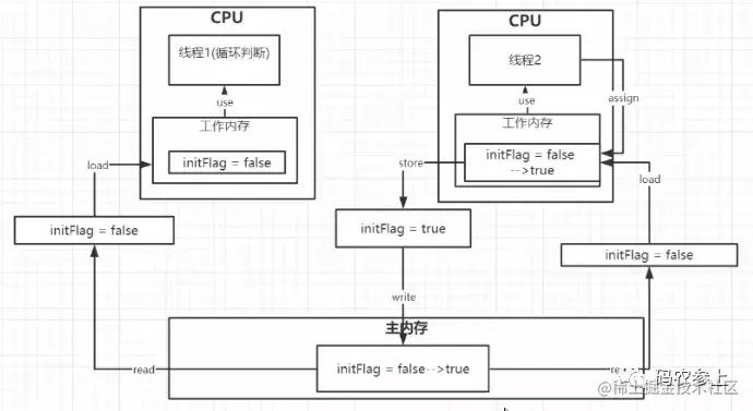 很明显,线程1无法跳出循环的原因是它读取的一直是自己工作内存中的flag,而没有获取到主内存中更新后的值。