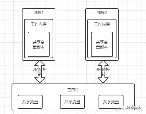 如上图中所示,java中运行的线程是不能直接读写主内存的变量,而是只能操作自己工作内存中的变量,然后再同步到主内存中。主内存是多个线程共享的,单线程间不共享工作内存,如果线程间需要通信,必须借助主内存中转来完成。