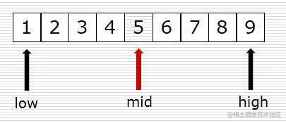 备选数组的第一位是low,备选数组的最后一位为high。备选数组最中间的元素为mid