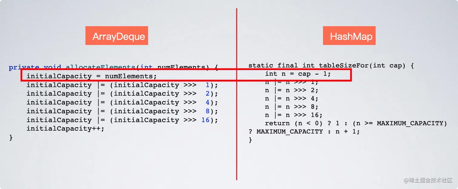 HashMap 的 2 的整数次幂计算逻辑,在进行位运算之前先执行了 cap - 1 的操作,而 ArrayDeque 没有,这么做的区别在于,假设传进去来的是 8 正好是 2 的整数次幂, ArrayDeque 计算出来的结果是 16,而 HashMap 的计算结果是其本身 8 ,这么做的目的,是为了省内存。