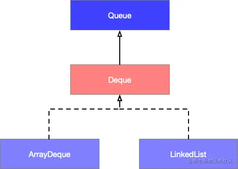 双端队列( Deque )的子类分别是 ArrayDeque 和 LinkedList,ArrayDeque 基于数组实现的双端队列,而 LinkedList 基于双向链表实现的双端队列,它们的继承关系如下图所示。