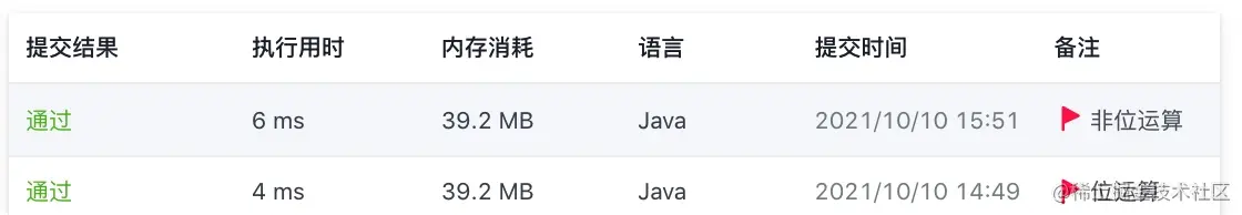 很明显 位运算 效率远远高于 非位运算,数据量越大,差距会越来越大,并且我在测试过程中,通过 位运算 的方式提交, 在 Java 提交中打败了 100% 的用户。