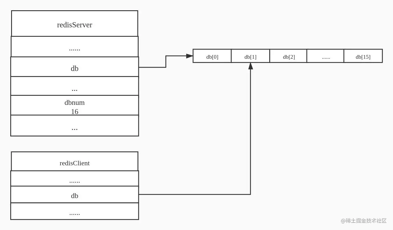 在服务器内部,客户端redisClient 结构的db属性记录了客户端当前的目标数据库,这个属性是一个指向 redisDb结构的指针