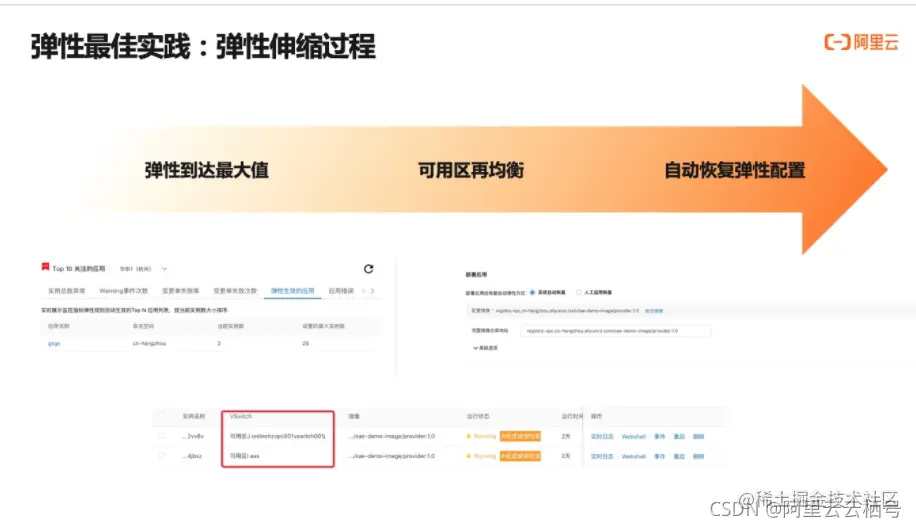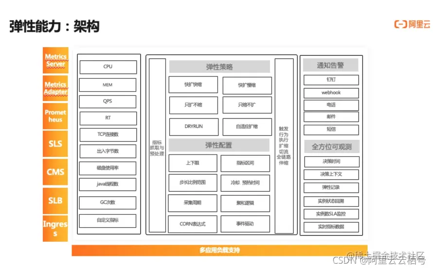 同时可以进行更为精细化的弹性参数配置,如实例上下限,指标区间,步长比例范围,冷却、预热时间,指标采集周期和聚和逻辑,CORN 表达式,后续也会支持事件驱动的能力。弹性触发后会进行对应的扩缩容操作,并通过切流保证流量无损,并且可以借助完善的通知告警能力(钉钉,webhook,电话,邮件,短信)来实时触达告知用户。弹性伸缩提供了全方位的可观测能力,对弹性的决策时间,决策上下文进行清晰化展现,并且做到实例状态可回溯,实例 SLA 可监控。