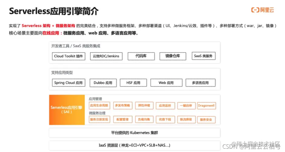 在时代背景下,SAE 应运而生,SAE 是一款面向应用的 Serverless PaaS 平台,支持 Spring Cloud、Dubbo 等主流开发框架,用户可以零代码改造直接将应用部署到 SAE,并且按需使用,按量计费,可以充分发挥 Serverless 的优势为客户节省闲置资源成本,同时体验上采用全托管,免运维的方式,用户只需聚焦于核心业务开发,而应用生命周期管理,微服务管理,日志,监控等功能交由SAE完成。