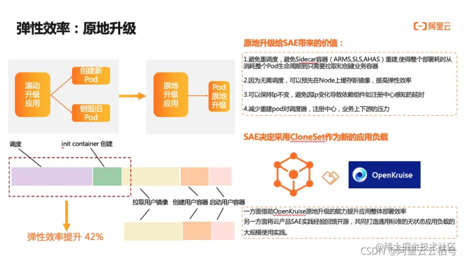 原地升级给SAE带来了诸多价值,其中最重要的是避免重调度,避免 Sidecar 容器(ARMS,SLS,AHAS)重建,使得整个部署耗时从消耗整个 Pod 生命周期到只需要拉取和创建业务容器,于此同时因为无需调度,可以预先在 Node 上缓存新镜像,提高弹性效率。SAE 采用阿里开源 Openkruise 项目提供的 Cloneset 作为新的应用负载,借助其提供的原地升级能力,使得整个弹性效率提升 42%。