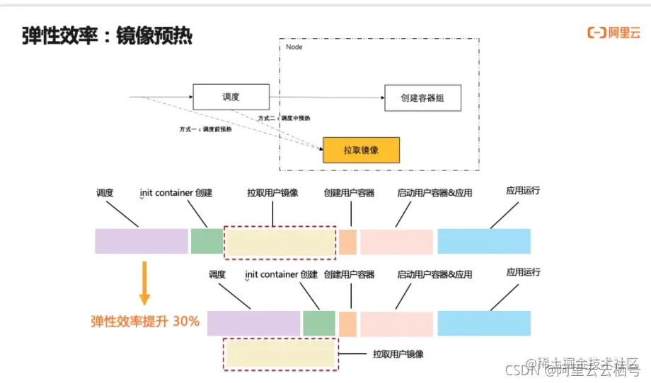同时 SAE 采用了镜像预热能力,其包含两种预热形式:调度前预热,SAE 会对通用的基础镜像进行全节点缓存,以避免其频繁的从远端进行拉取。与此同时对于分批的场景支持调度中预热,借助 Cloneset 原地升级能力,在升级的过程中可以感知到实例的节点分布情况,这样就可以在第一批部署新版本镜像的同时,对后面批次的实例所在节点进行镜像预拉取,进而实现调度与拉取用户镜像并行。通过这项技术,SAE 弹性效率提升了 30%。