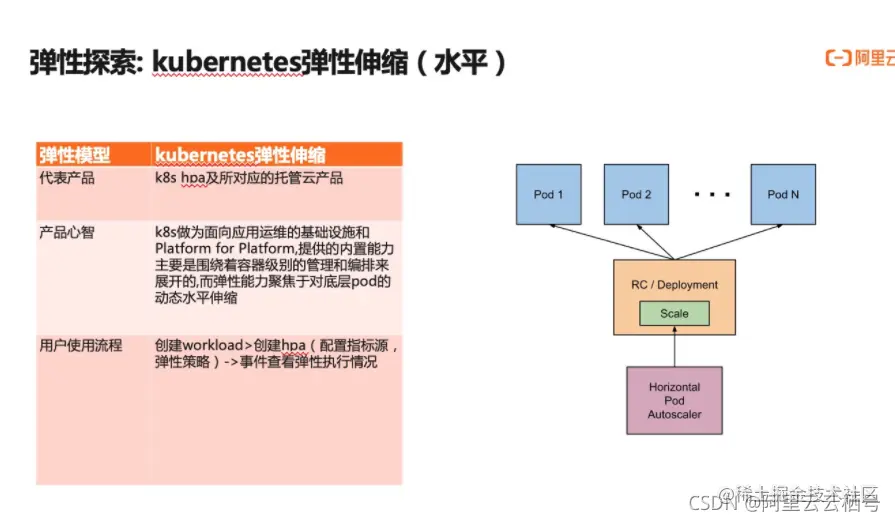 Kubernetes 弹性伸缩,这里主要关注于水平弹性 hpa,其代表产品为 K8s 以及其所对应的托管云产品,如阿里云容器服务,K8s 做为面向应用运维的基础设施和 Platform for Platform,提供的内置能力主要是围绕着容器级别的管理和编排来展开的,而弹性能力聚焦于对底层 Pod 的动态水平伸缩,K8s hpa 通过轮询 Pod 的监控数据并将它与目标期望值比较进行,通过算法实时计算来产生期望的副本数,进而对 Workload 的副本数进行增减操作,用户在实际使用上需要创建并配置对应的指标源和弹性规则以及对应的 Workload,可以通过事件来查看弹性的执行情况。